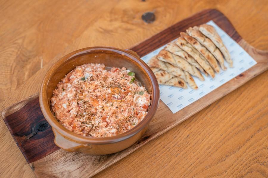 Traditional scrambled eggs with Feta cheese, cherry tomatoes, green peppers and chili flakes.